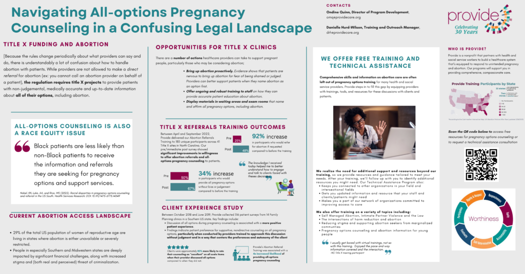 Provide is seeking to partner with Title X grantees, particularly in the U.S. South and Midwest where abortion is restricted. Our collaborative approach begins with an in-depth consultation and site assessment to develop a tailored training and technical assistance plan to support your organization in implementing policies, processes, and practices that promote stigma-free access to abortion and other stigmatized health services as an integral part of your standards of care and institutional culture.